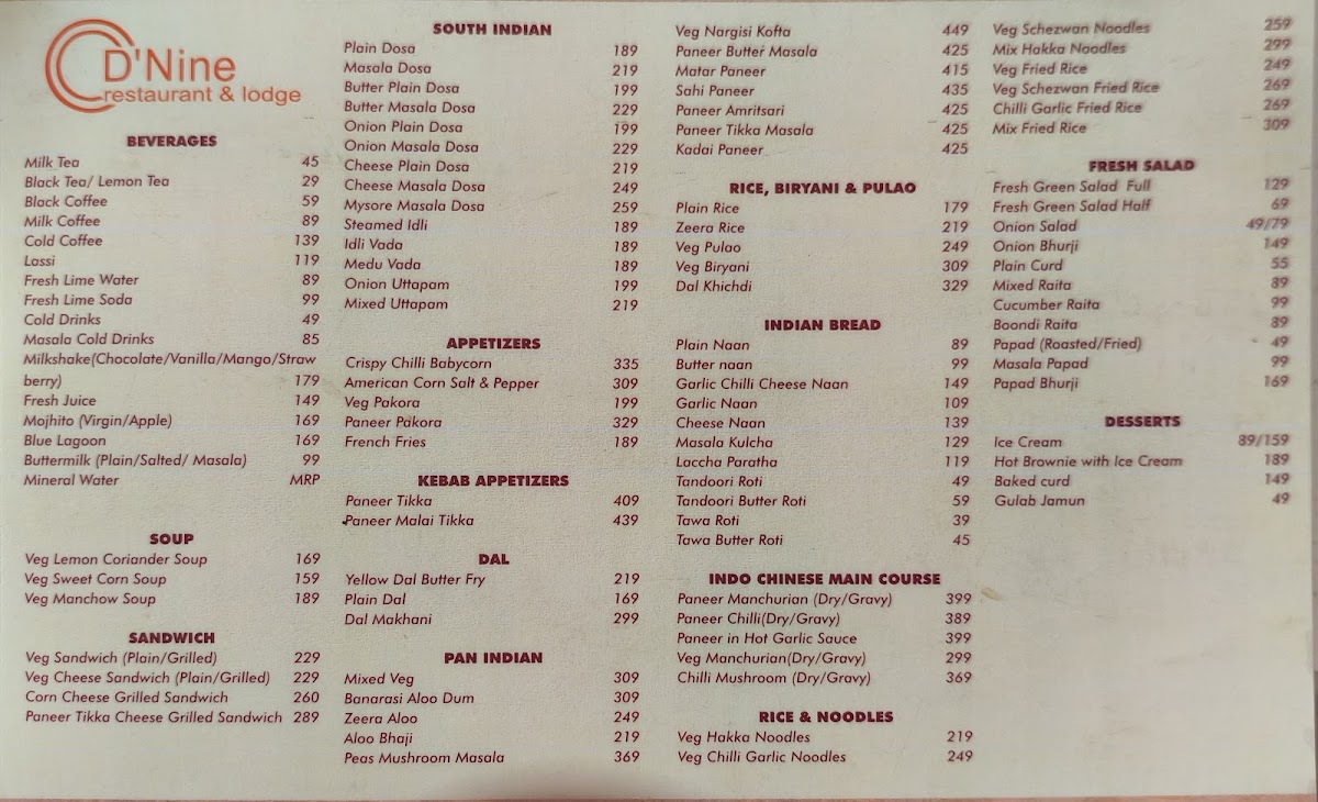 One of the most striking features of D’nine Restaurant is its extensive menu, which caters to diverse culinary preferences. Whether you are a fan of robust vegetarian options or exquisite non-veg delicacies, there’s something for everyone. Signature dishes like Chilli Paneer and Chicken Lollipop have garnered rave reviews for their outstanding flavors and appealing presentations. Each dish is crafted with fresh ingredients, showcasing the chef's dedication to quality and taste.